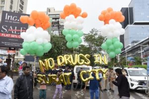 ૨૬ જૂન-‘આંતરરાષ્ટ્રીય ડ્રગ્સ વિરોધી દિવસ’ નિમિત્તે સુરતવાસીઓને ડ્રગ્સના દૂષણ સામે જાગૃત્ત કરવા માટે સુરત શહેર પોલીસ અને નાર્કોટિક્સ કંટ્રોલ બ્યુરો દ્વારા ગૃહ રાજ્યમંત્રીશ્રી હર્ષ સંઘવીના અધ્યક્ષસ્થાને પાલ ખાતે ડ્રગ્સ વિરોધી જાગૃતિ રેલી યોજાઈ હતી. પાલ આર.ટી.ઓ. સર્કલ થી પાલ પોલીસ સ્ટેશન સુધી આયોજિત આ રેલીમાં પોલીસ અધિકારી-કર્મચારીઓ, સામાજિક સંસ્થાઓ, વિવિધ શાળાના વિદ્યાર્થીઓએ ‘સે નો ટુ ડ્રગ્સ, સે યસ ટુ સ્પોર્ટ્સ’, ‘નો ડ્રગ્સ ઇન સુરત સિટી’, ‘કેફી પદાર્થનું સેવન એટલે વગર નિમંત્રણથી મોતને આમંત્રણ’, જીવનને કહો હા, ડ્રગ્સ દૂષણને કહો ના’ જેવા સંદેશ આપતા બેનરો, કટઆઉટ સાથે સમાજમાં ડ્રગ્સના દૂષણ સામે જાગૃતિ ફેલાવી હતી.