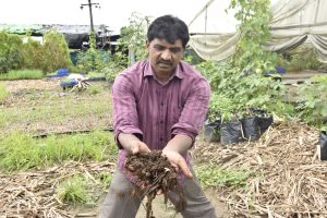 બોક્ષઃ સૌથી મહત્વનો ફાળો અળસિયાનો હોવાનું જણાવતા તેઓ કહે છે કે, બેડમાં છાણીયા ખાતર, શેરડીની પરાળ કે અન્ય લીલો કચરો નાખતાની સાથે અળસિયા ટુંકા દિવસોમાં કમ્પોસ્ટ તૈયાર કરે છે, જે આ રોપાઓઓ માટે સંજીવનીનું કામ કરે છે. કમ્પોસ્ટ ખાતરના કારણે ખેતરમાં વાવેલ ભીંડાની ઉચાઈ ૧૫ ફુટ તથા એલચી કેળની ઉચાઈ ૩૫ ફુટ જેટલી થઈ છે.