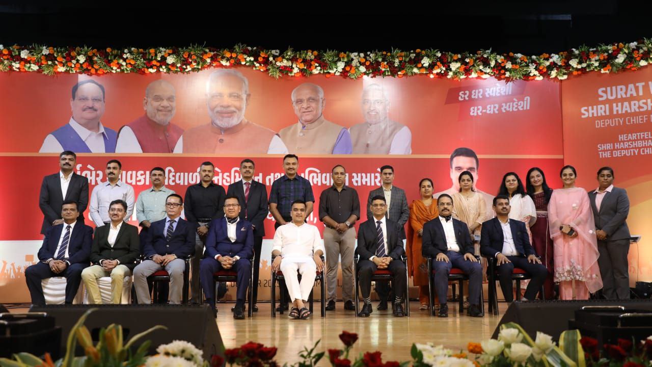 રાજ્યના નવનિયુક્ત નાયબ મુખ્યમંત્રી શ્રી હર્ષ સંઘવી નાયબ મુખ્યમંત્રી તરીકેનો પદભાર સંભાળ્યા બાદ આજે પોતાના મત વિસ્તાર સુરત પહોંચ્યા હતા. સુરતમાં તેમના ઉમળકાભેર સ્વાગત બાદ સરસાણા કન્વેન્શલ હોલમાં નાયબ મુખ્યમંત્રીશ્રીની પ્રેરક ઉપસ્થિતિમાં સુરત પોલીસ પરિવાર, GSRTC તેમજ RTOના અધિકારીઓ-કર્મચારીઓ સહિત શહેરીજનો સાથે દિવાળી સ્નેહમિલન તથા અભિવાદન સમારોહ યોજાયો હતો.