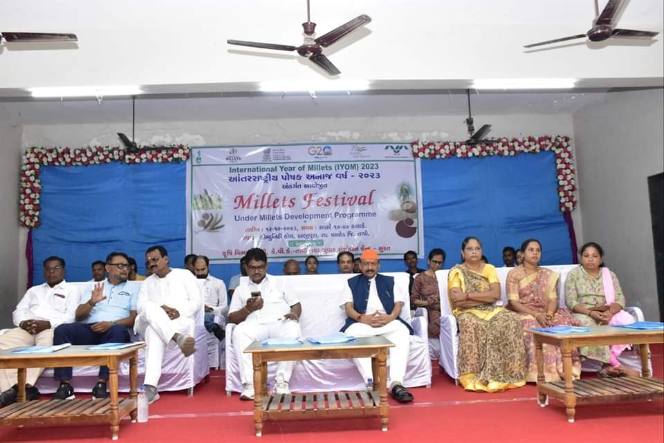 યુનાઇટેડ નેશન્સ દ્વારા વર્ષ 2023 ને આંતરરાષ્ટ્રીય મિલેટ્સ વર્ષ તરીકે ઉજવવામાં આવી રહ્યું છે.જેના ભાગ રૂપે લોકોમાં મિલેટ્સ પાકોના ન્યુટ્રીશન વેલ્યુ અંગે જાગૃતિ આવે હેતુસર ઉજવણી કરવાનું નક્કી કરવામાં આવ્યું હતું.જે અંતર્ગત વાલોડ તાલુકાના બાજીપૂરા ગામે આવેલ માતૃભૂમિ સંસ્કાર ભવન હોલ ખાતે આંતરરાષ્ટ્રીય મિલેટ્સ વર્ષ નિમિત્તે આયોજિત કૃષિ મેળો અને કૃષિ પ્રદર્શન મેળામાં મહુવા 170 મત વિસ્તારના ધારાસભ્ય મોહનભાઈ ઢોડીયા હાજર રહી મિલેટ્સ અંગે માર્ગદર્શન પૂરું પાડ્યું હતું.